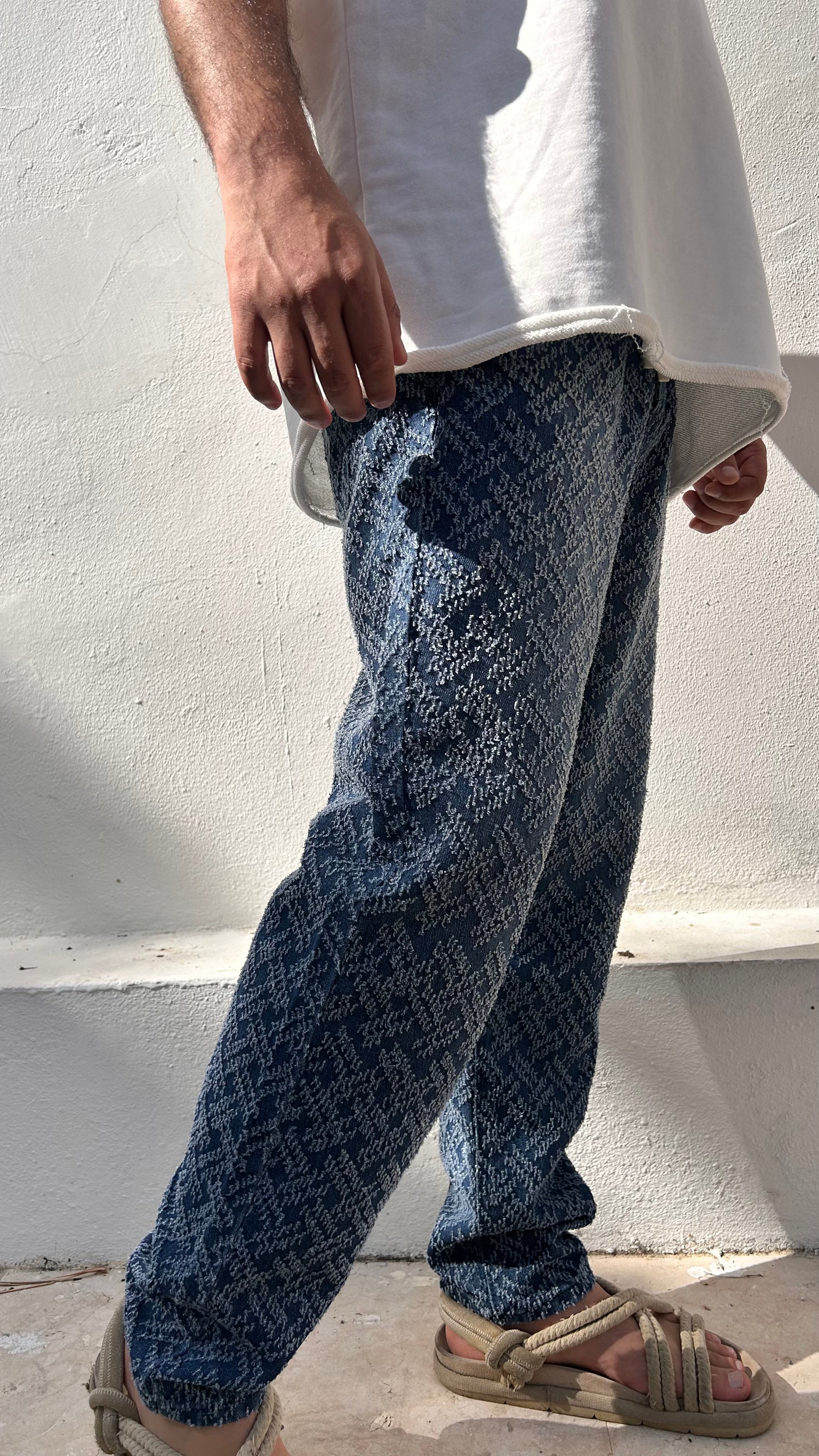 Crafted from textured raw blue denim, these unisex pants feature an all-over woven pattern and a flexible elastic waistband for everyday comfort. On the back pocket, a bold flame embroidery draws inspiration from Jewish heritage, adding depth and identity to the design.