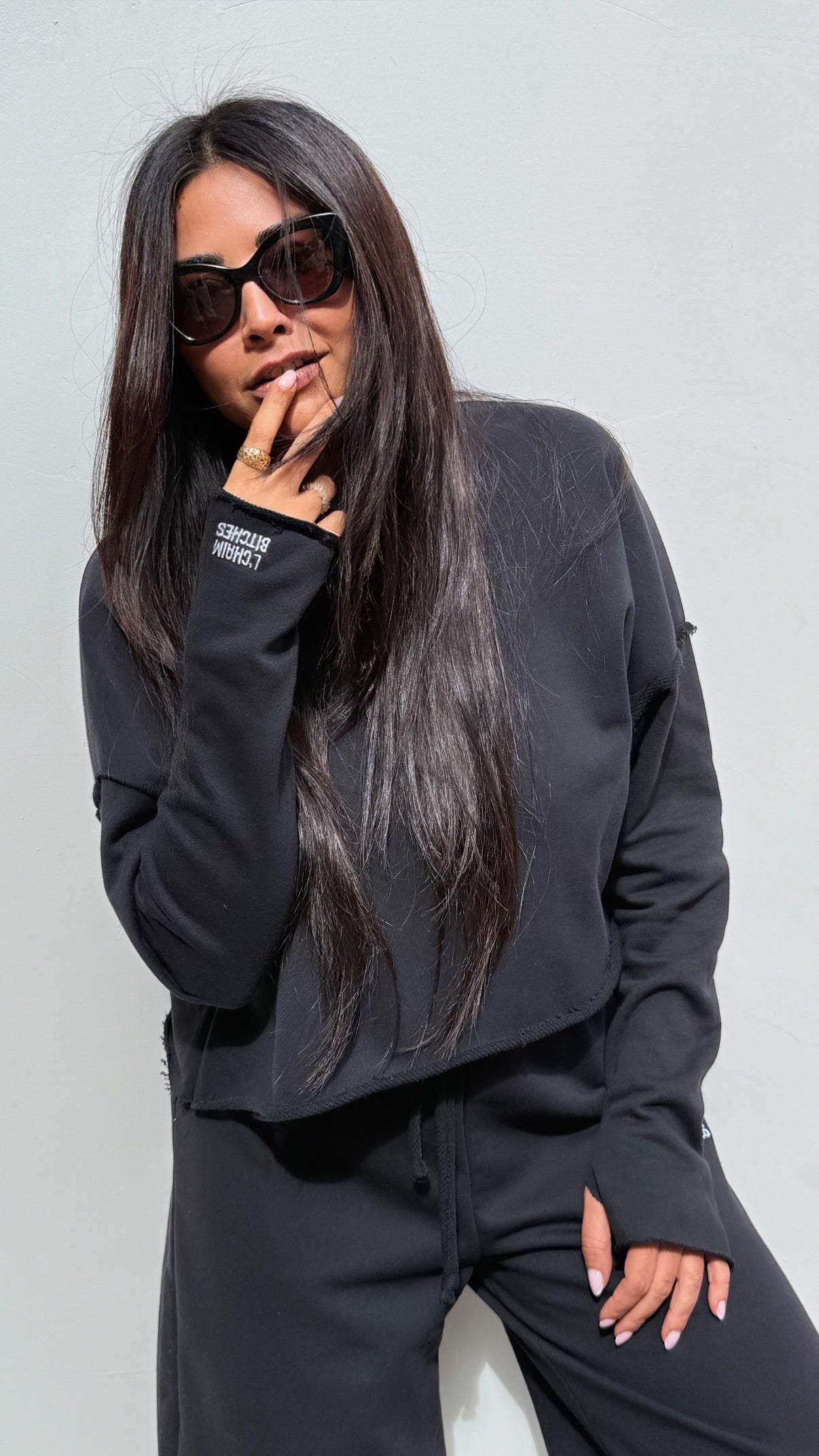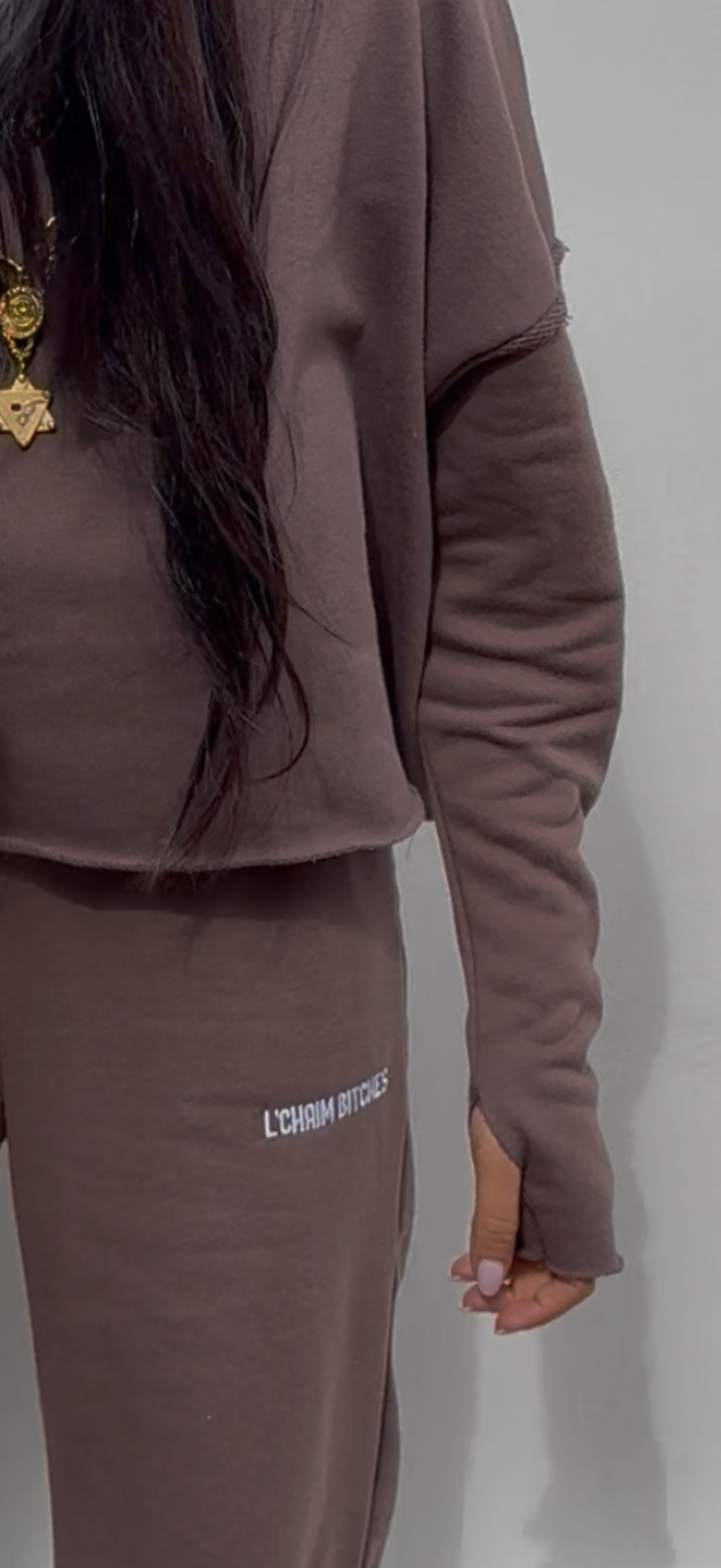 . Hilarious embroidery “L’CHAIM BITCHES” placed on the hand