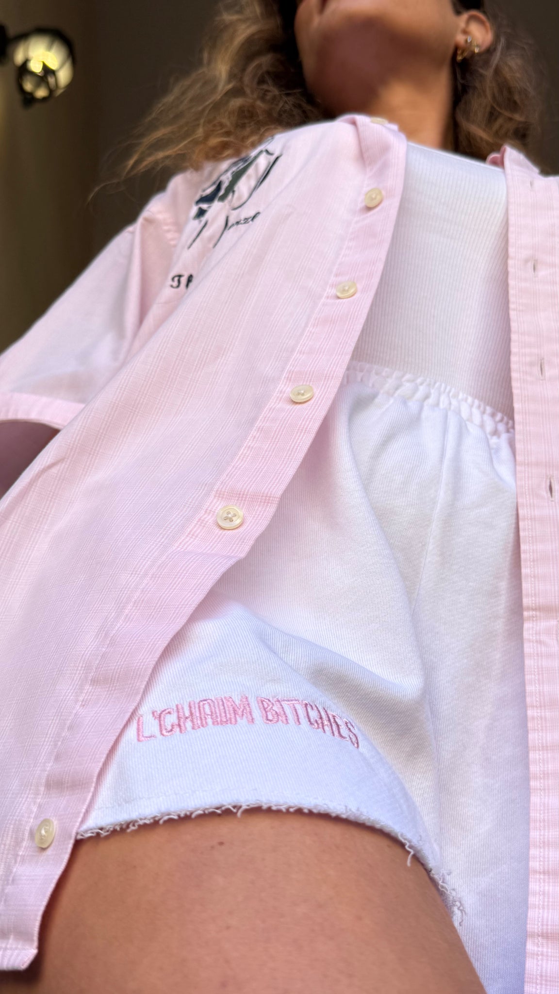 L’Chaim, Bitches – because comfort should come with attitude.These ultra-soft beige shorts are made for chill days, bold moves, and big energy.With raw-cut edges and embroidered sass, they celebrate life, loud and proud.