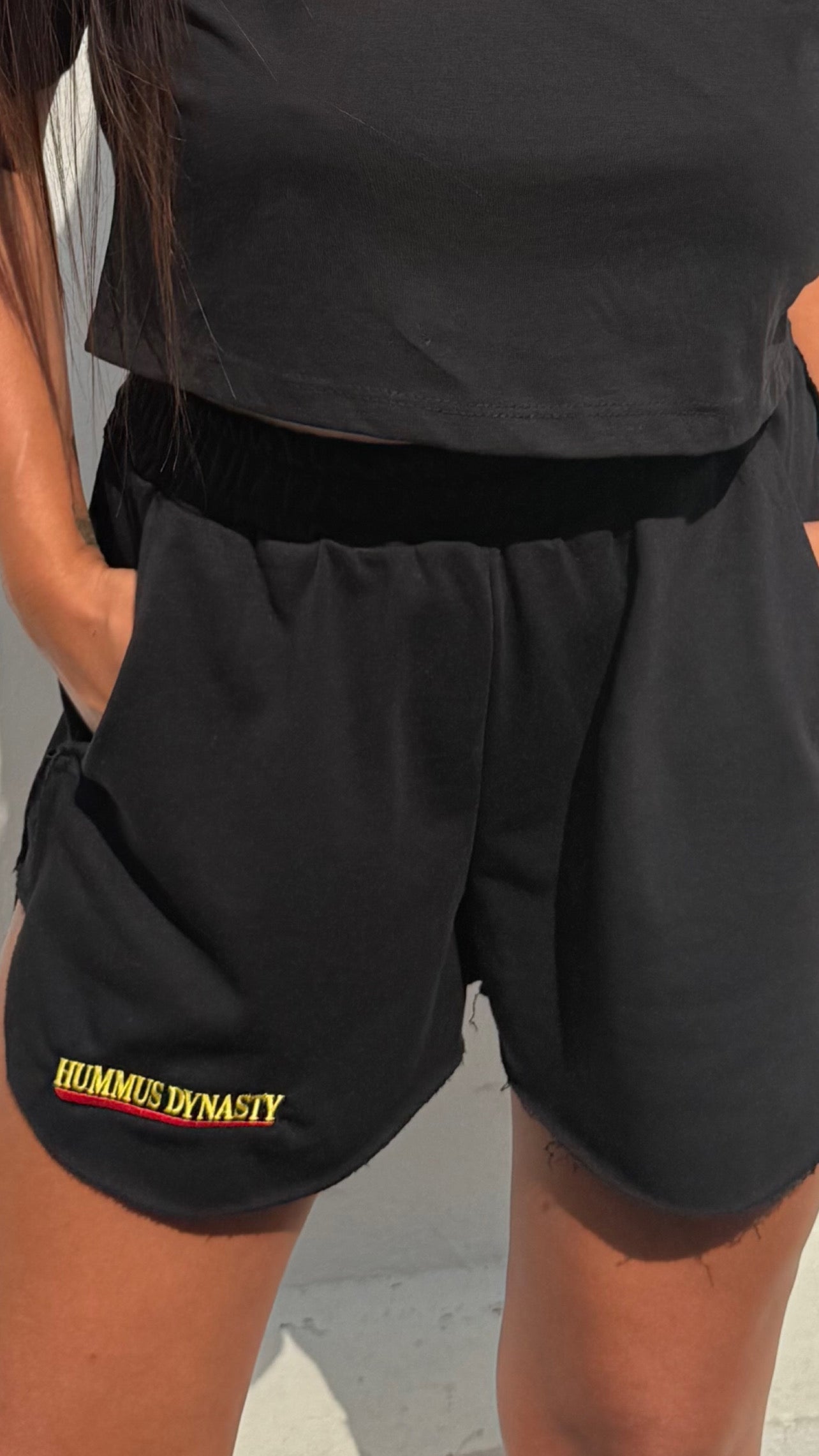 - “HUMMUS DYNASTY” embroidered in yellow and red on the leg